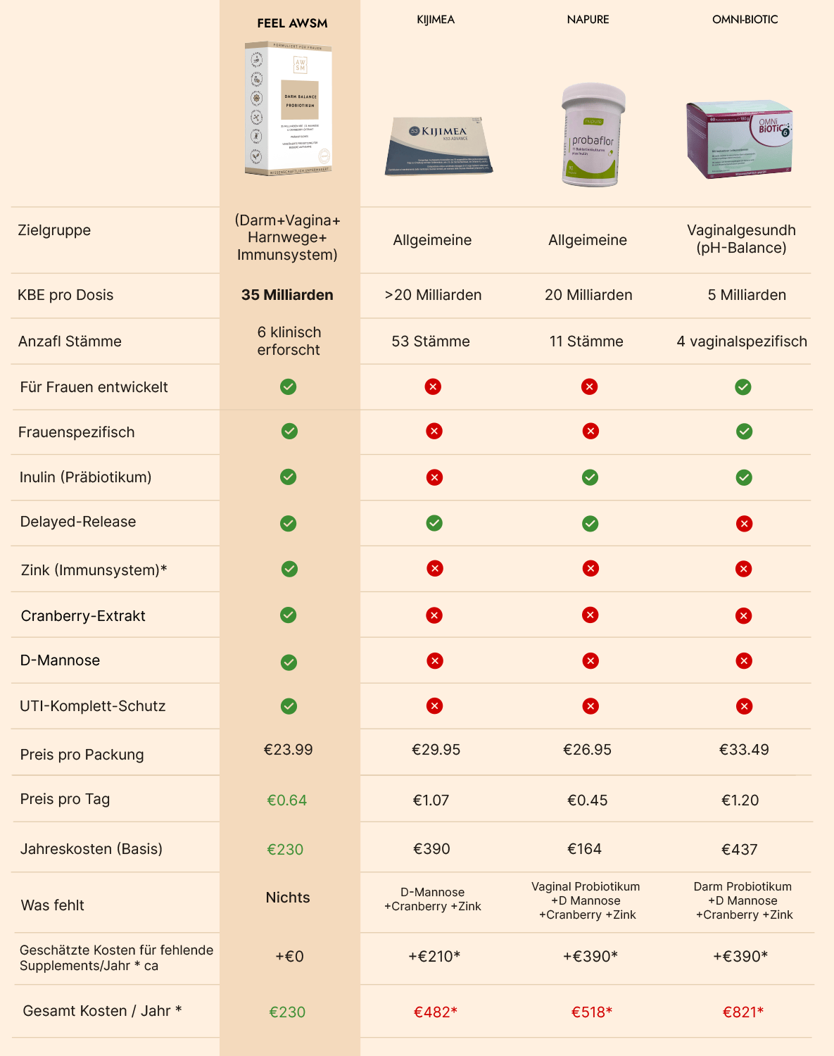 Das Darm Balance Probiotikum wurde mit einer einzigen, starken Absicht entwickelt: Frauen dabei zu helfen, sich jeden Tag leicht, vital und selbstbewusst zu fühlen. Wir kombinierten 35 Milliarden KBE von sechs klinisch geprüften Stämmen mit Zink für das Immunsystem, plus D-Mannose und Cranberry-Extrakt, die im Bereich Frauengesundheit bekannt sind, für eine umfassende Formel, die das Verdauungsgleichgewicht, den Harnwegskomfort und die Immunstärke unterstützt – und das in nur einer veganen Kapsel.