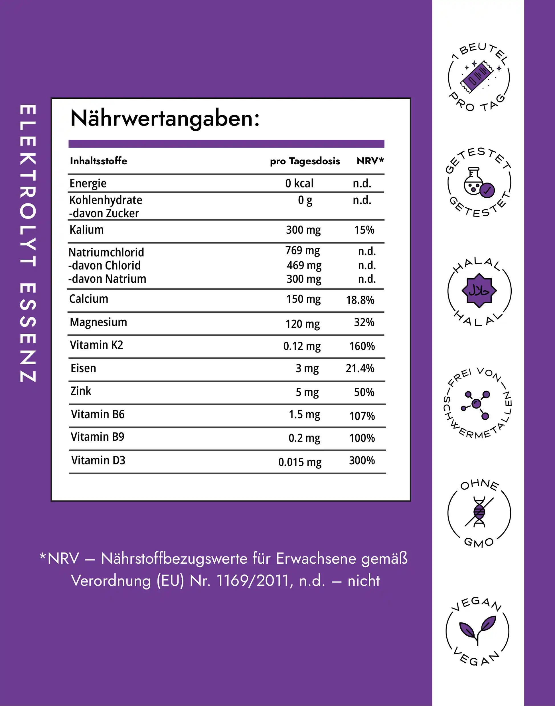 Elektrolyttoleranz: Diese Formel ist leicht verdaulich und für den täglichen Gebrauch geeignet. Empfindliche Personen sollten in den ersten drei bis fünf Tagen mit einer halben Portion beginnen, um die Verträglichkeit zu testen.