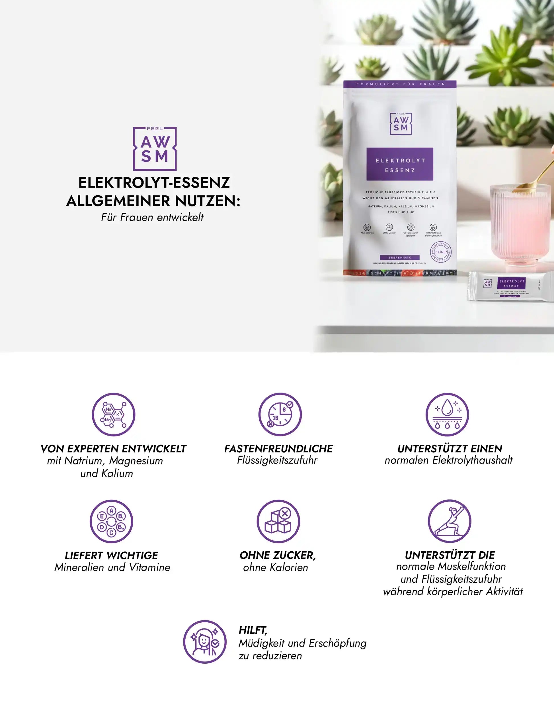 Es handelt sich nicht um eine weitere Elektrolytmischung, sondern um eine Elektrolyt-Formel für Frauen, die alles schaffen. Mit 6 essentiellen Mineralstoffen und aktiven Vitaminen unterstützt sie die Hydratation, Energie und den Flüssigkeitshaushalt, und das ganz ohne Zucker, Kalorien oder Kompromisse.