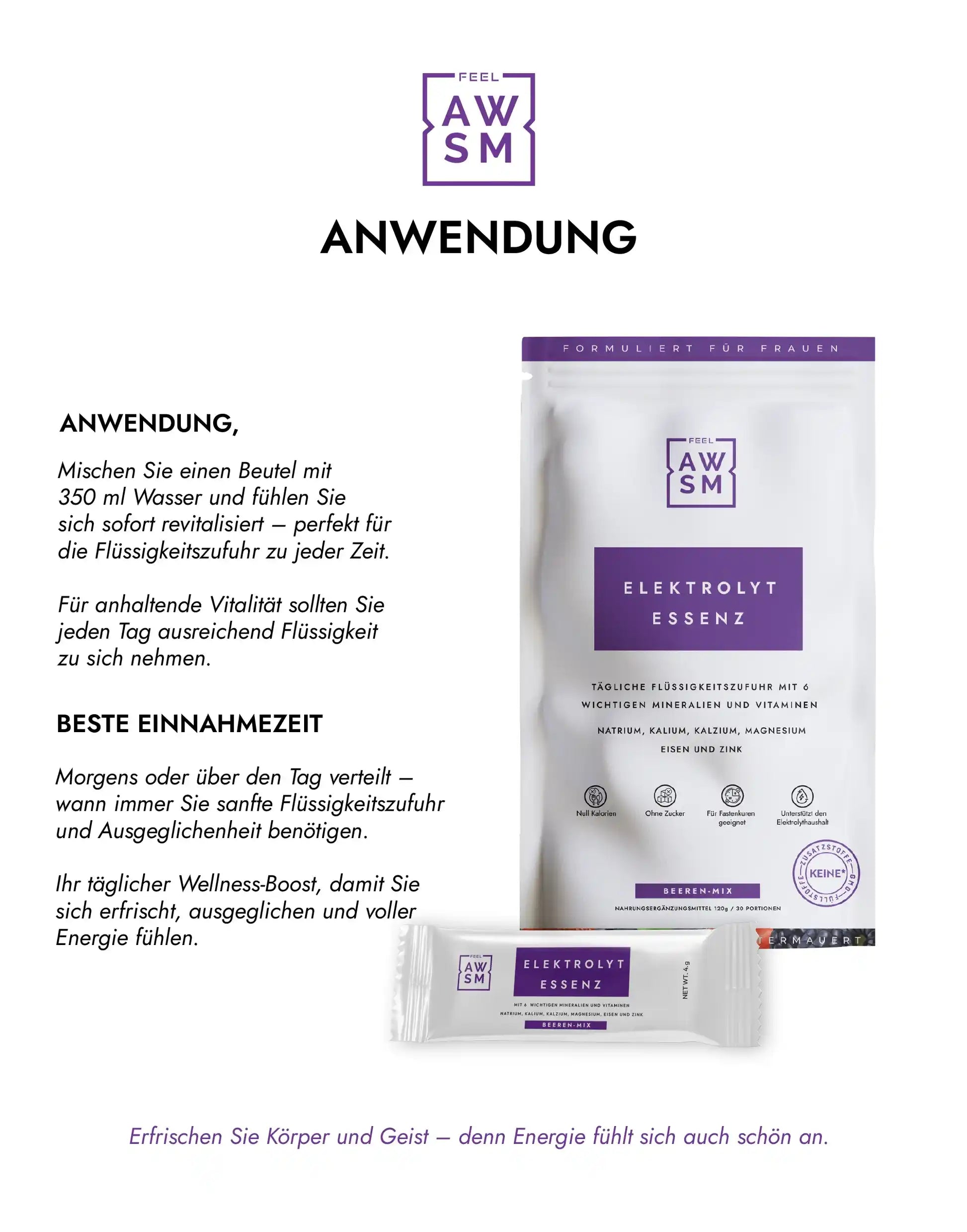 Den Inhalt eines Beutels mit 250–500 ml kaltem Wasser vermischen. Gut umrühren oder schütteln. Einmal täglich genießen – idealerweise morgens, während des Fastens, nach dem Sport oder wann immer Ihr Körper Erfrischung benötigt.