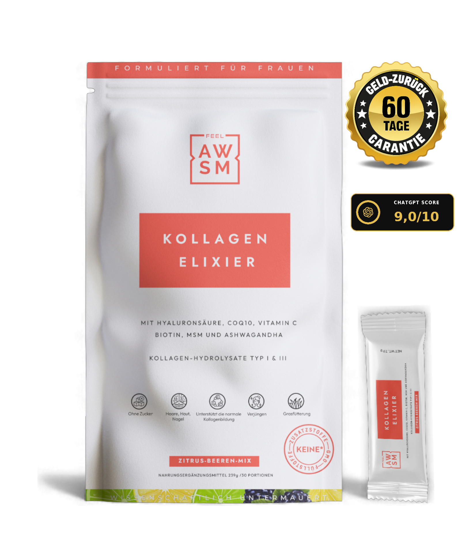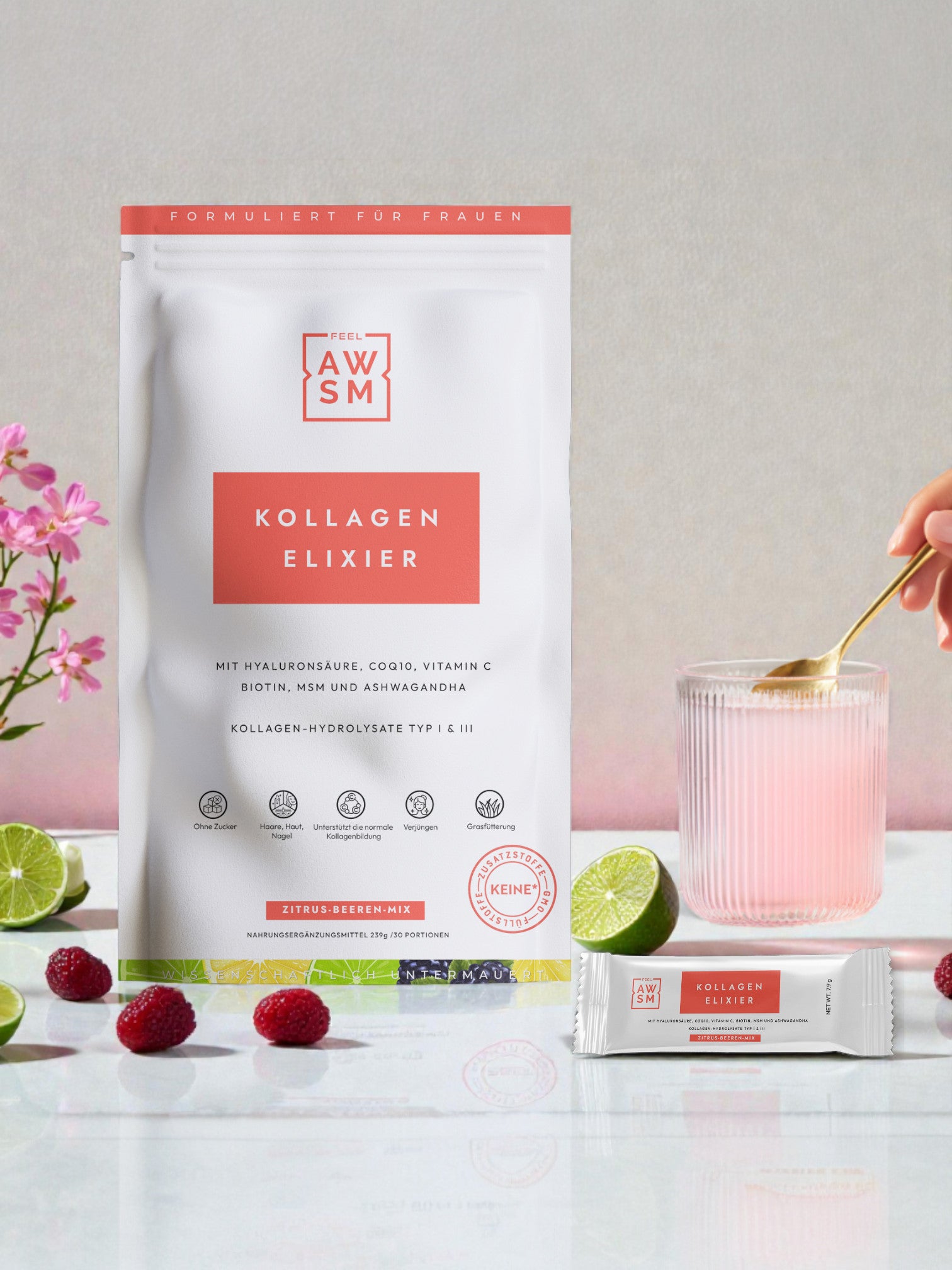 Kollagen allein reicht nicht aus. Ihr Körper braucht Vitamin C, um Kollagen zu verwerten. Biotin und Zink für Haare und Nägel. Ashwagandha, um zu verhindern, dass Stress alles zerstört.