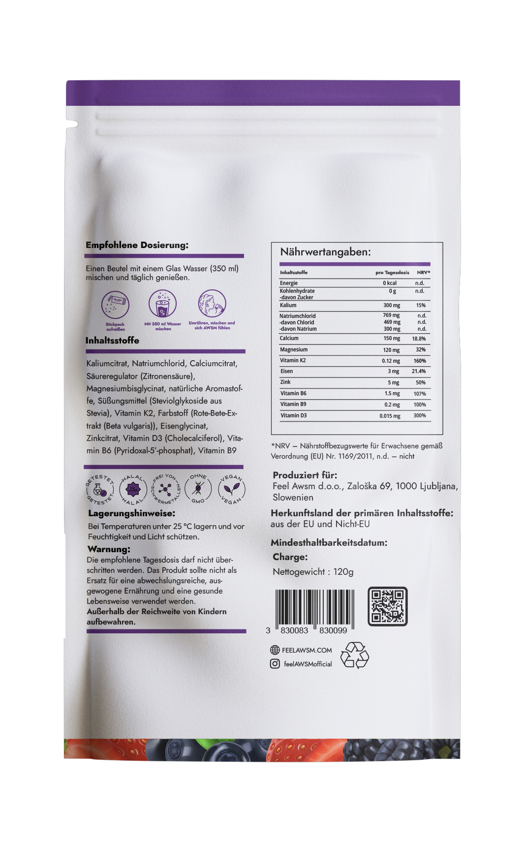 Ingredients:Potassium citrate, sodium chloride, calcium citrate, acidity regulator (citric acid), magnesium bisglycinate, natural flavourings, sweetener (steviol glycozides from stevia), vitamin K2, colour (beetroot (Beta vulgaris) leaf extract), iron bisglycinate, zinc citrate, vitamin D3 (cholecalciferol), vitamin B6 pyridoxal 5′-phosphate), vitamin B9 (advifolate)