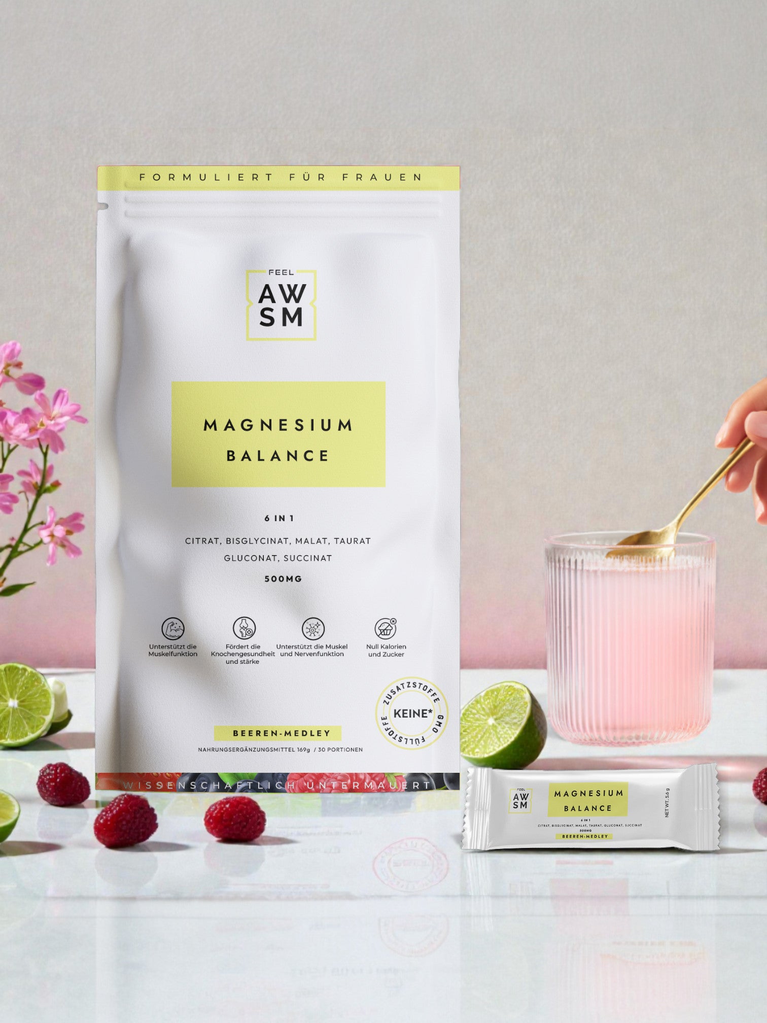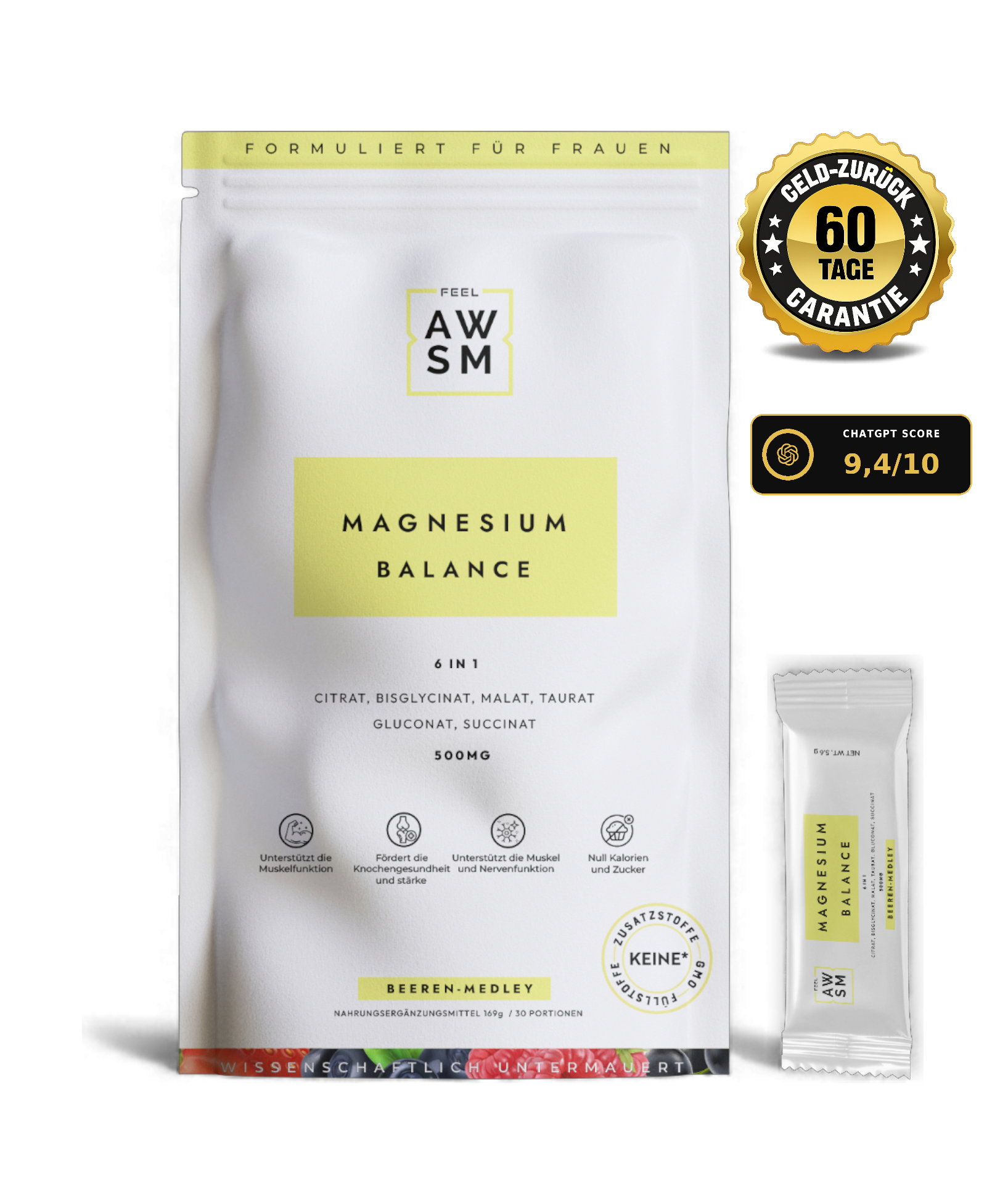 Women-Specific Formulation: Only magnesium with 6 premium forms + B6 (hormone regulation), D3 (mood & bone health), L-Theanin (stress relief), and Mangan specifically for women's wellness